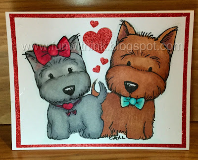 I got a digital image from Tiddly Inks that was just perfect as a Valentine card.   I printed the image twice on Georgia Pacific cardstock but only cut out and colored the heads on one.  The other image I colored the entire image using a mix of Spectrum Noir, Copic and Blick Studio.   I am trying to use up extra paper so I found some Paper Studio red glitter cardstock in my stash that was perfect for punching out the hearts and for the border.